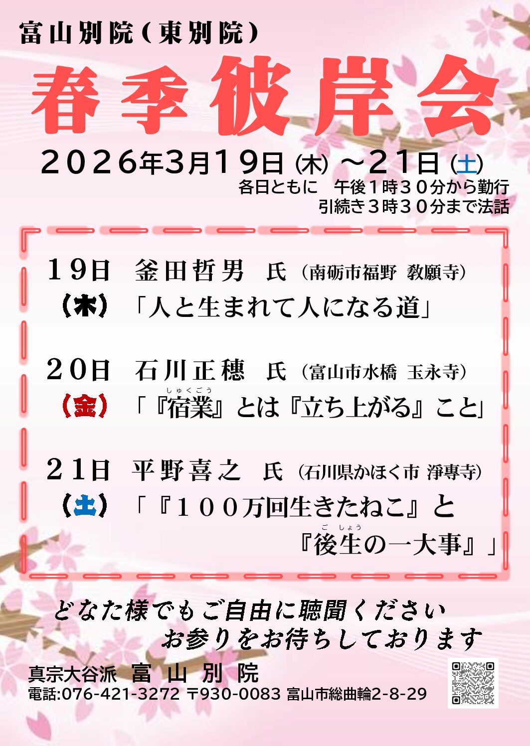 富山別院彼岸会のご案内 3月19日(木)から21日(土)まで春季彼岸会を開催いたします。 皆様お誘い合わせてご参詣ください。 ※各日とも午後1時30分からお勤め、引き続き3時30分まで法話があります。 ※詳細は👇 2026春季彼岸会 参詣案内